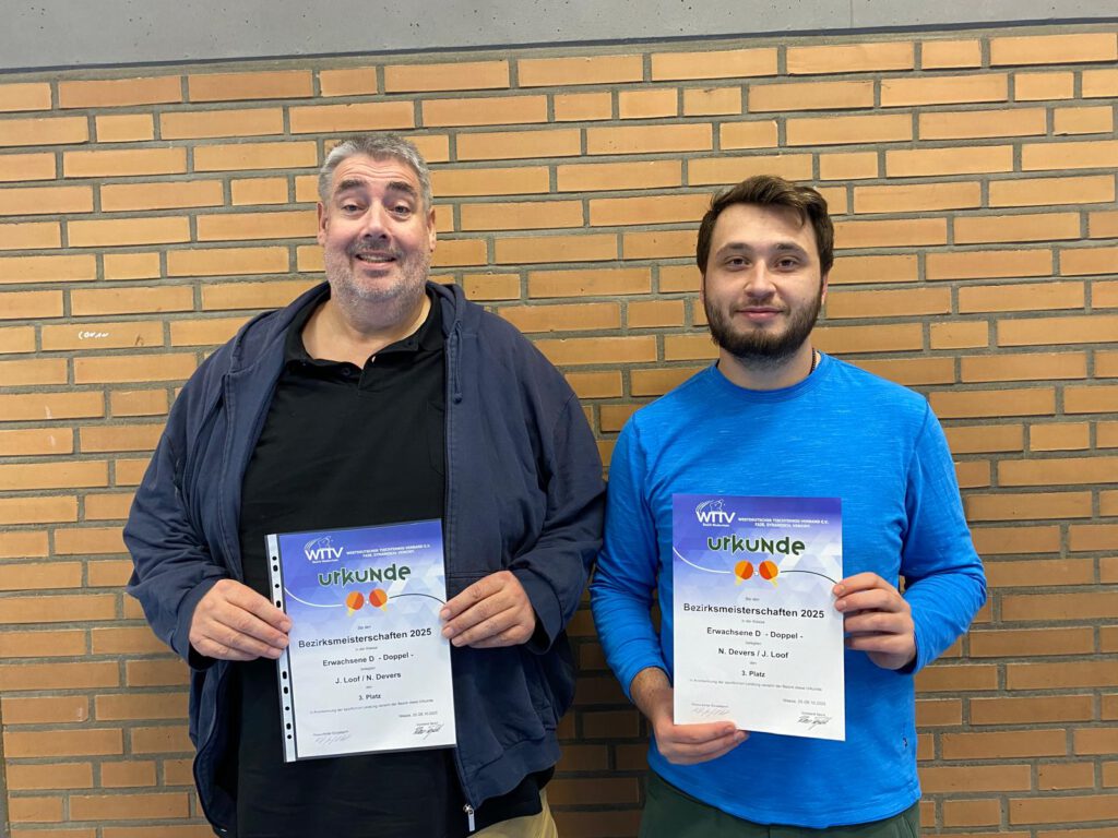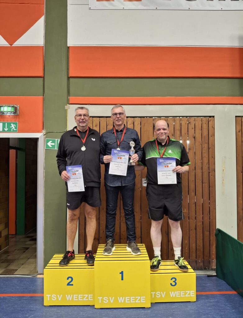Super lief es auch für Jörg Loof und Niklas Devers in der Herren D-Konkurrenz. Sportwart Michael Boekholt hatte den beiden unmittelbar vor dem Turnierbeginn augenzwinkernd mit auf dem Weg gegeben: „Kein Druck, aber drei Medaillen sollten es schon sein!“ Und Niklas und Jörg hielten diesem „Druck“ stand. Beide kämpften sich im Doppel bis ins Halbfinale vor und verpassten den Finaleinzug nur knapp. Bronze! Im Einzel gewannen Jörg und Niklas ihre Vorrundengruppen sowie ihre Achtel- und Viertelfinalspiele, ehe sie im Halbfinale aufeinandertrafen. Hier unterlag Niklas seinem Mannschaftskollegen der 3. Herren und durfte sich mit dem Gewinn von Bronze trösten. Jörg ging im Finale gegen Norbert Aengenheister (TTC BW Sevelen) nach einer 2:1-Satzführung etwas die Puste aus und freute sich letztlich über Silber. Damit schafften Niklas und Jörg mit insgesamt drei Medaillen tatsächlich die „Vorgaben“ des Sportwarts.