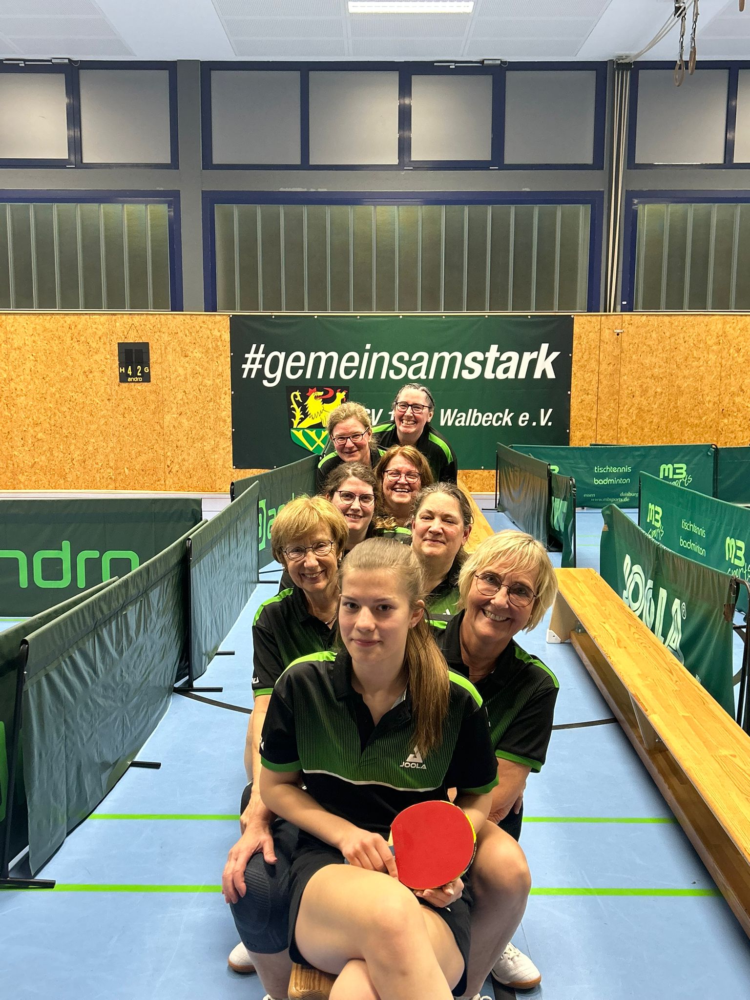 Auch bei den Damen war die Freude sehr groß. Die 2. Damen gehört auch in der kommenden Saison der Bezirkoberliga an, da der Mitkonkurrent 1. TTC Viersen mit 6:4 bezwungen werden konnte. Manuela van Adrichem-Hendrix, Marianne Sieben und Hannah Hendrix punkteten im Einzel. Hinzu kamen drei kampflose Punkte, da Viersen nur zu dritt antrat. Die Erste war ernsthaft wohl nie in Abstiegsgefahr. Durch den klaren 8:2-Sieg gegen ETuS Wedau ist der Erhalt der Verbandsliga bereits drei Spieltage vor Schluss nunmehr auch rechnerisch sicher. Nach ausgeglichenen Doppeln gewannen Geli Holla, Corinna Hoffmann und Britta Spehr jeweils zwei Einzel, während Teamchefin Hanne Hebinck einen Punkt beisteuerte.